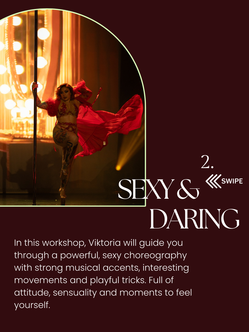 In this workshop, Viktoria will guide you through a powerful, sexy choreography with strong musical accents, interesting movements and playful tricks. Full of attitude, sensuality and moments to feel yourself.